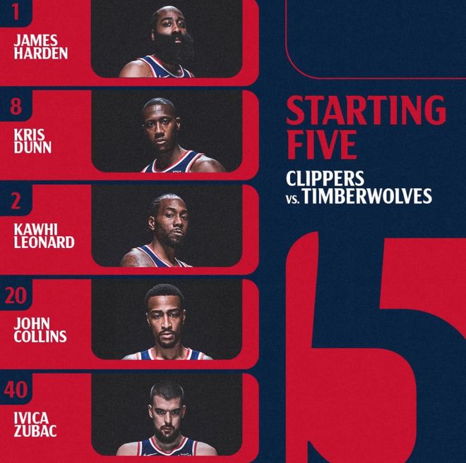 首发阵容方面,快船队这边,保罗未随队,比尔、波格丹诺维奇、小琼斯继续缺席比赛,泰伦卢排出的最新首发五人组为:哈登、邓恩、伦纳德、科林斯、祖巴茨;森林狼队这边,首发阵容则为:迪温琴佐、爱德华兹、麦丹、兰德尔、戈贝尔。